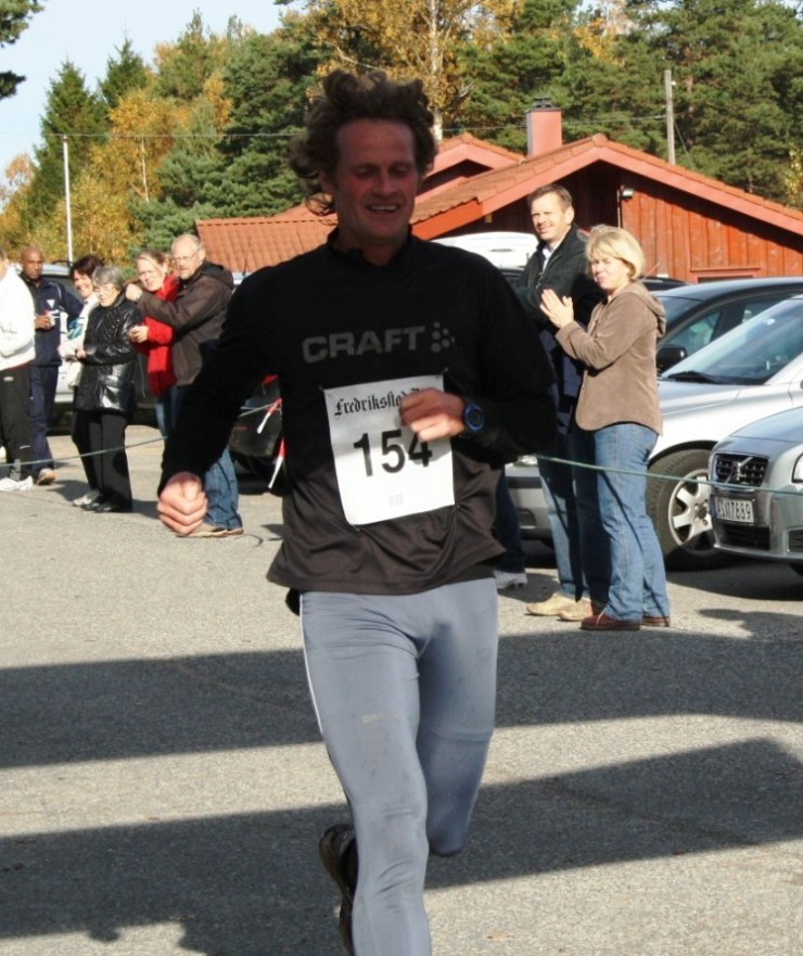 Vinner av herreklassen, Tor Øyvind Ødegård fra Fredrikstad IF, krysser målstreken.
